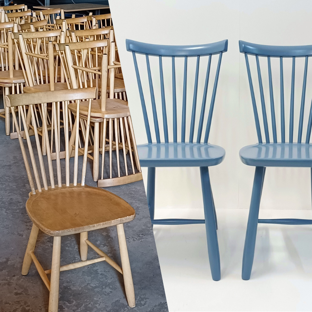 Många år i en skolmatsal sätter sina spår, men med möbelrekonditionering och renovering fick nära 100st klassiska Lilla Åland formgivna av Carl Malmsten och tillverkade av Stolab en ny chans genom oss på Cirkulärfabriken.